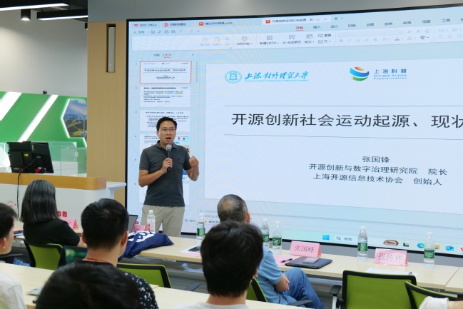 此外,为了让学生进一步接触行业前沿、理解开源文化的机会,9月12日,我院博达讲坛邀请上海开源信息技术协会秘书长,上海对外经贸大学开源创新与数字治理研究院院长张国锋开展《开源创新社会运动历史、现状与未来》讲座。张国锋在讲座中指出,开源作为数字经济的公共基础设施,需打破独占排他思维,讲求开放共享;讲座从现实动因、理论基础、实践路径三个维度,剖析开源创新国际合作的挑战与出路,让同学们对数字世界新规则有了深入了解。