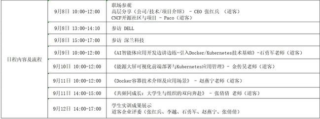 经学院与道客网络科技公司的多轮协商与精心设计,确定了本次夏令营的主旋律为“企业参访—企业导师线下讲解+任务驱动学生自主探索—学生汇报展示”。学生参访了云原生领域的创新领导者上海道客(DaoCloud)网络科技有限公司、世界500强企业戴尔(DELL)股份有限公司、人工智能领域领军企业深兰人工智能科技(海)股份有限公司,学习了云原生的核心技术Docker/Kubernets,并以小组形式完成了“能源大屏可视化前端部署”、“AI智能体应用开发”项目的设计、开发与部署。道客公司首席执行官张红兵、技术总监李越、技术专家石勇军、技术专家赵燕宁、技术专家张倩倩参与授课,并参加学生汇报答辩评审。同学们答辩表现优秀,现场收到企业的实习邀请。