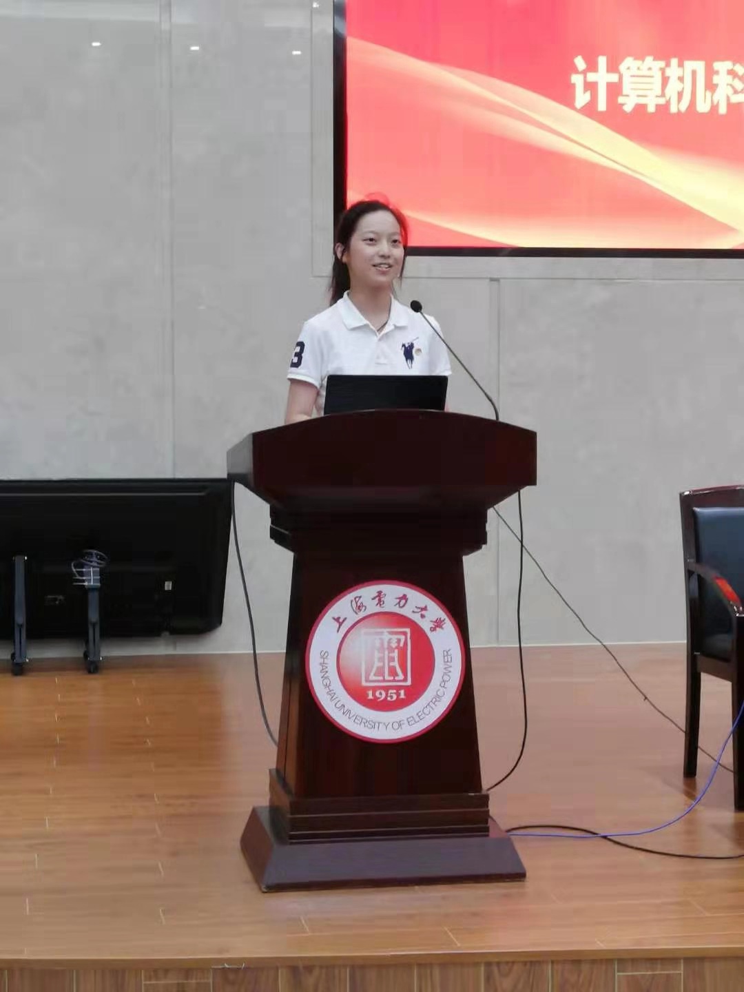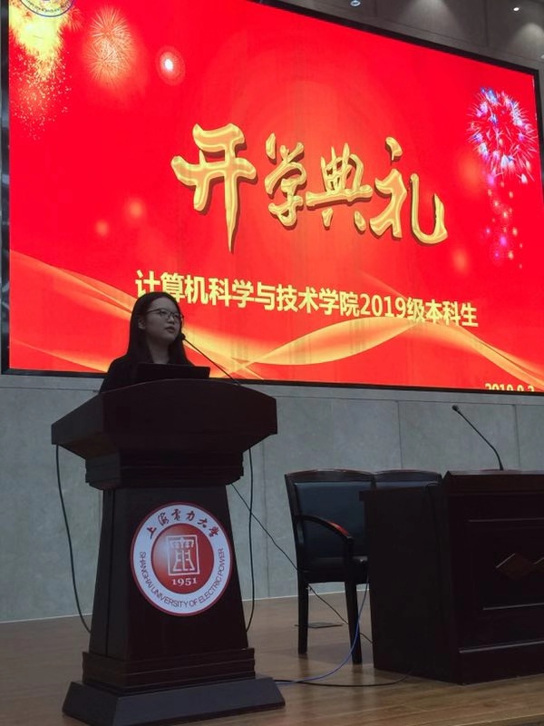 随后,信息安全专业2019252班戴骏捷同学作为新生代表进行发言,她表示,在大学期间会珍惜学校和学院优越的学习资源,以热情的态度投入丰富多彩的大学生活,肩负时代使命,激扬青春梦想。将小我融入大我,以舍我其谁的责任感,用担当铺就成就之路,努力书写电力最美好的未来。