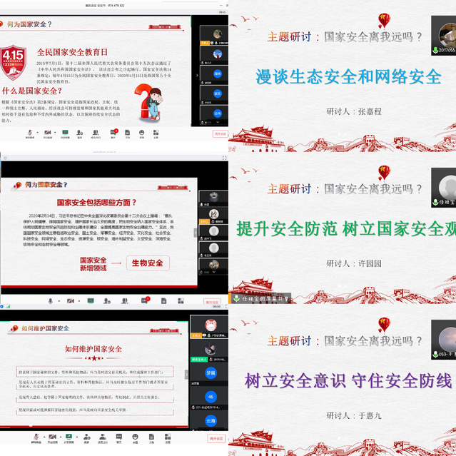 学院本科生、研究生辅导员依托年级会、主题班会等形式,以“坚持总体国家安全观,统筹传统安全和非传统安全,为决胜全面建成小康社会提供坚强保障”为主题,通过腾讯会议进行国家安全教育。鼓励全体学生学习《国家安全法》相关法律条文,了解高校治安稳定真实案例,收看全民国家安全教育日新闻宣传报道,引导学生了解国家安全的多面性与重要性,准确把握总体国家安全观,自觉提升国家安全意识。
