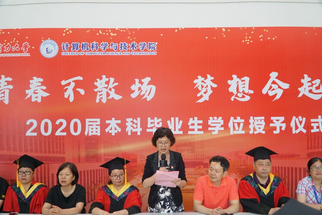 首先,院党委书记魏建华致辞,她代表学院向2020届全体毕业生表示热烈的祝贺!同时,她表达对同学们的殷切希望:第一,坚定理想,爱国奉献;希望同学们秉持“博达而砺行,谨严以求新”的院训精神,永怀赤子情怀,为国担当、为民尽责。第二,只争朝夕,不负少华;随着人工智能,5G通讯,大数据,云计算等智能技术迅猛发展,同学们生逢其时、肩负重任。希望大家志存高远、脚踏实地,把个人的理想追求融入党和国家事业之中,同学们处在一个唯创新者进、唯创新者强、唯创新者胜的新时代,是这个时代的见证者、亲历者和创造者。第三,凡是过往,皆为序章。在这场抗击新冠肺炎疫情的严峻斗争,让这届毕业生经受磨练、收获成长,也使你们切身体会到“志不求易者成,事不避难者进”的道理。前进的道路从不会一帆风顺,实现中华民族伟大复兴的中国梦,需要一代一代的青年矢志奋斗。