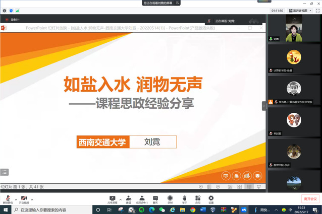 西南交通大学刘霓副教授作题为“如盐入水,润物无声——课程思政经验分享“的报告。作为教育部课程思政示范课程《计算机应用基础》的课程负责人,刘霓老师介绍了计算机应用基础课程确定的培养学生“四价值一精神两意识”的思政目标,以及“加强教学团队融合,打造一流师资队伍”、“改进课程内容,突出课程特色”、“改进教学设计和方法,打造一流课程”的具体做法,最后分享了大量体现课堂温度和教学态度的学生评价。