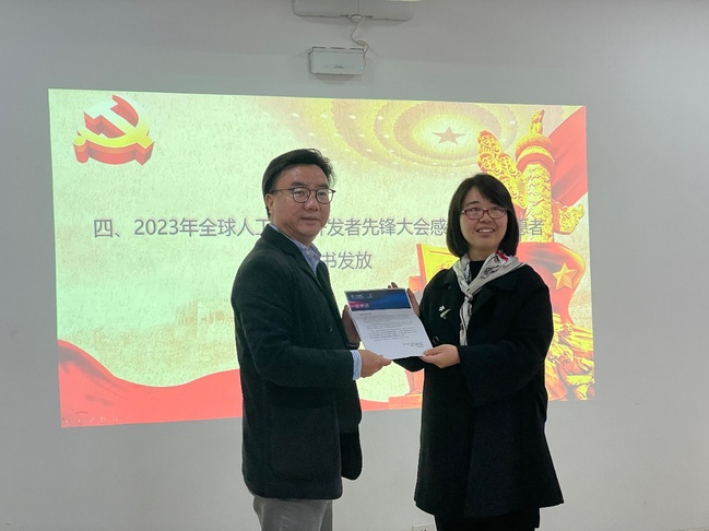 最后,朱部长代表协会赠予学院感谢信,感谢学院为2023年全球人工智能开发者先锋大会培养并提供优质的志愿者以及对相关工作大力支持,并颁发了志愿者证书。