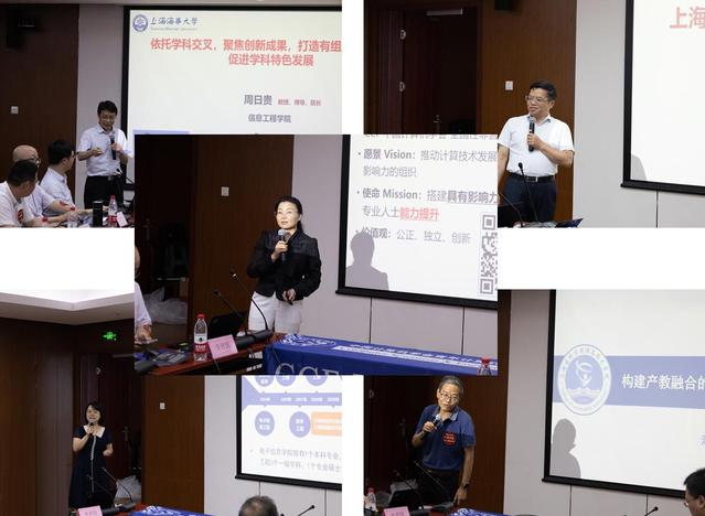 第一位嘉宾是来自上海海事大学信息工程学院的院长周日贵教授,分享了题为“依托学科交叉,聚焦创新成果,打造有组织的科研,促进学科特色发展”的引导发言,介绍了信息工程学院的计算机学科建设特色,以现代信息技术前沿研究与港航、物流等特色学科相结合,以智慧航运、智慧物流、智慧园区建设等为应用背景,推进相应的人才培养机制、高水平科研平台建设;第二位嘉宾是来自上海海洋大学信息学院院长陈明教授,主要介绍了信息学院以智慧海洋、智慧渔业为特色的学科建设情况,并对上海海洋大学海洋导航遥感与智能信息工程技术研究中心进行了详细介绍;第三位嘉宾是来自旧版云顶国际yd222院长温蜜教授,对学院以能源电力特色为基础的学科建设情况进行了介绍,并作为CCF YOCSEF上海荣誉委员和老主席对CCF YOCSEF上海与临港的互动进行了回顾、对未来的发展提出了建议;第四位嘉宾是来自上海电机学院电子信息学院副院长李靖超教授,分享了电子信息学院以智能装备为特色在学科建设、教学研究、产教融合方面所做的工作,并介绍了电机学院与企业的深度合作模式;第五位嘉宾是上海建桥学院信息技术学院院长张文俊教授,分享了题为“构建产教融合的应用型人才培养生态”引导发言,作为民办院校中的佼佼者,信息技术学院主要聚焦人工智能、集成电路、智能制造等行业,进行应用型人才培养与产教融合。