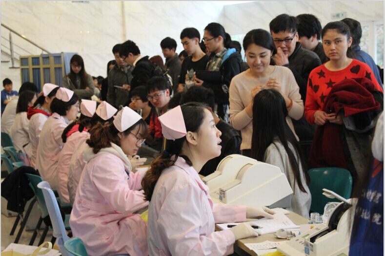 志愿者们一大早来到指定地点做好准备工作,协调配合医生开展献血活动。“有什么不适的话要赶快去医务室,不要逞强”,志愿者在现场叮嘱前来献血的同学。献血的同学按计划来到献血地点,在与工作人员协调之后,同学们按顺序进行了领表登记、血型测定、体检和抽血程序。第三次前来献血的大三同学提醒大家道“早上要吃饭,之后一定要注意休息”。组织这次活动的校医务室肖南老师肯定了我院积极踊跃的态度,指出学院每年重视献血活动,不论组织、协调都准备的很到位,也因此能圆满、超额的完成指标。在场的老师也说“通过这次活动,给大家提供了许多献爱心的机会,传递了青春正能量,践行了雷锋无私精神,更是弘扬了中国青年的无私精神。”献血后,院领导、老师们关心慰问了同学们的身体状况。
