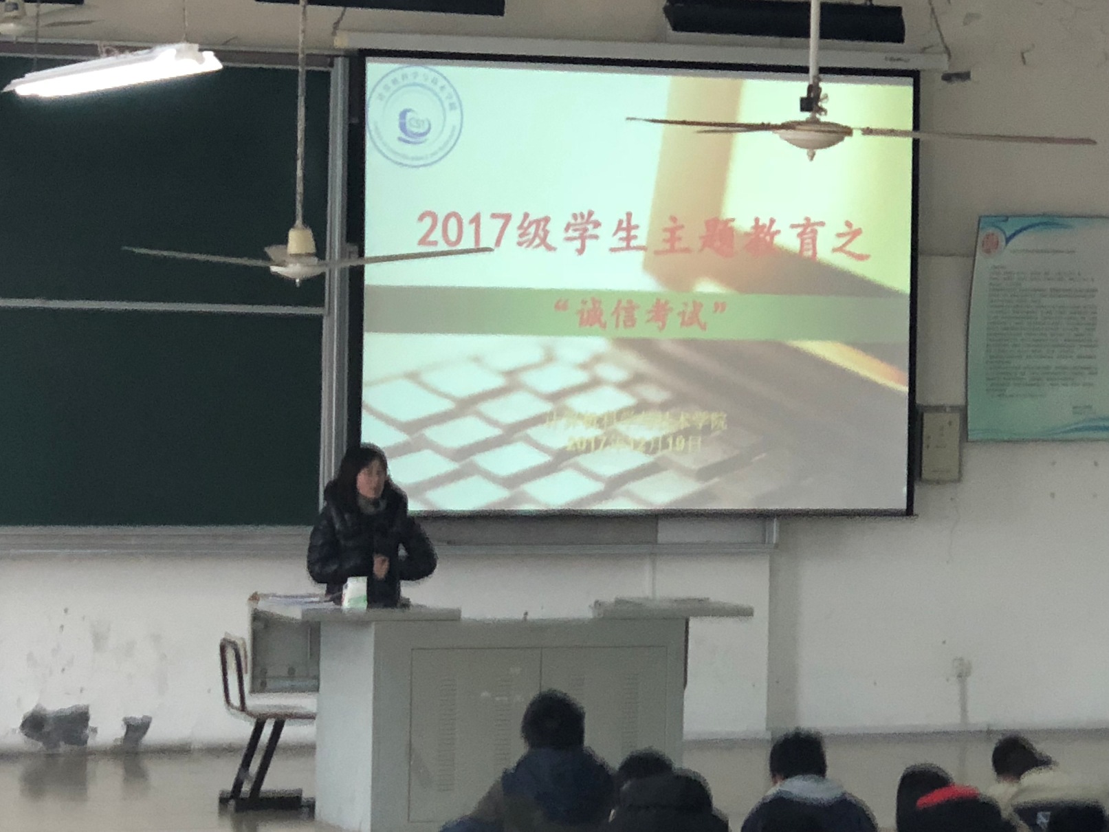 2017年12月19日,学院诚信考试动员大会由各辅导员分别召开。全体辅导员根据《学生手册》对于诚信考试的要求,从公民道德和学校制度两个方面进行了讲解,对于考试违纪处分的新规定进行了着重提醒,对全体本科生做了期末考风考纪动员。良好的学风、考风是学院教学工作、人才培养、学风建设的重要环节,希望大家诚信考试,坚守底线,认真备考,用实际行动实现自己的梦想。此外,辅导员发放了《诚信考试承诺书》,同学们在认真阅读后慎重签下了自己的名字。