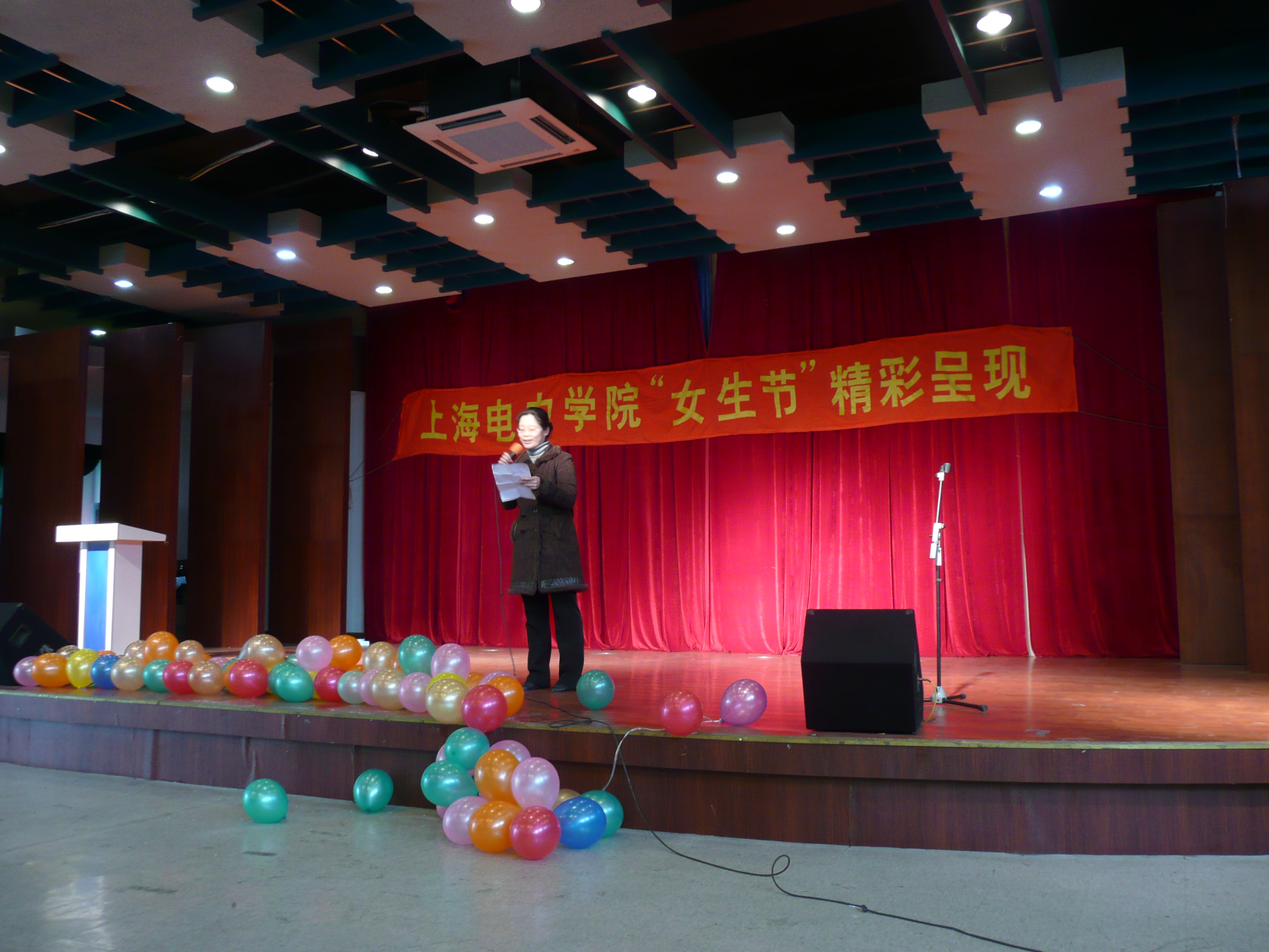 3月9日 上海电力学院“女生节”在我校南汇校区大学生活动中心举行了开幕仪式。校工会常务副主席、妇工委主任、赵玲老师,校团委副书记余嘉老师,校素质拓展学校马晨老师,计信学院辅导员程莹老师出席了开幕式。赵玲老师为“女生节”致词并宣布“女生节”开幕。