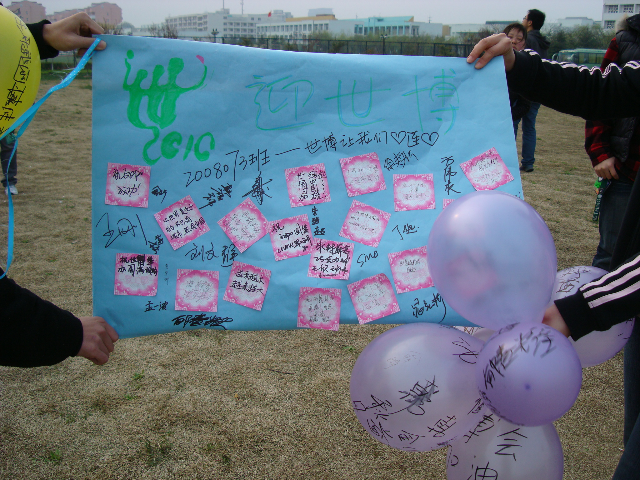 3月31日 我院2008073团支部在南汇校区草坪开展了“世博,让我们心连心”主题团日活动之二“为世博加油”。其间,同学们围成一圈,畅谈对世博的展望与期待。大家将自己对世博的祝福写在气球上将其放飞,共同制作了一个“愿望谱”为世博加油打气。最后,同学们在"丢手绢":和"拷贝不走样"的游戏中结束此次活动。