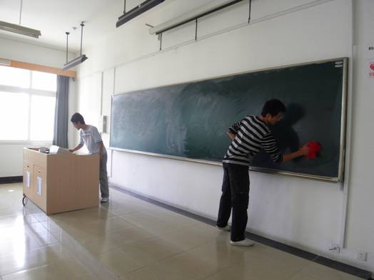 5月13日下午,我院“菁菁家园”项目组同学对北校区教学楼的黑板和讲桌进行擦洗,这是继“节能关灯”和“清洁校园白色垃圾”后的又一项感恩回馈学校的活动。同学们希望尽自己的一份力为我校师生营造一个良好的教学和学习环境,为校园增添了一抹亮丽的色彩。