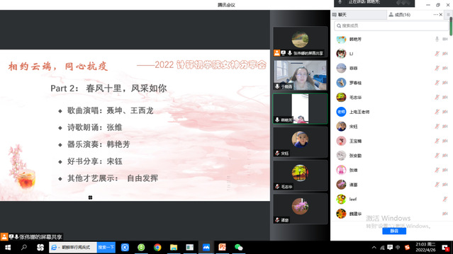 活动由学院工会主席于晓青主持,学院党委书记魏建华、院长温蜜、副书记齐永晓也积极参与到了活动中与女教师们交流分享。她们亦是十分关心女教师们的居家隔离生活和工作状态,关注女教师的身心健康!活动分为两个部分:一是防疫抗疫的经验分享;二是学院女教师的各类才艺展示。