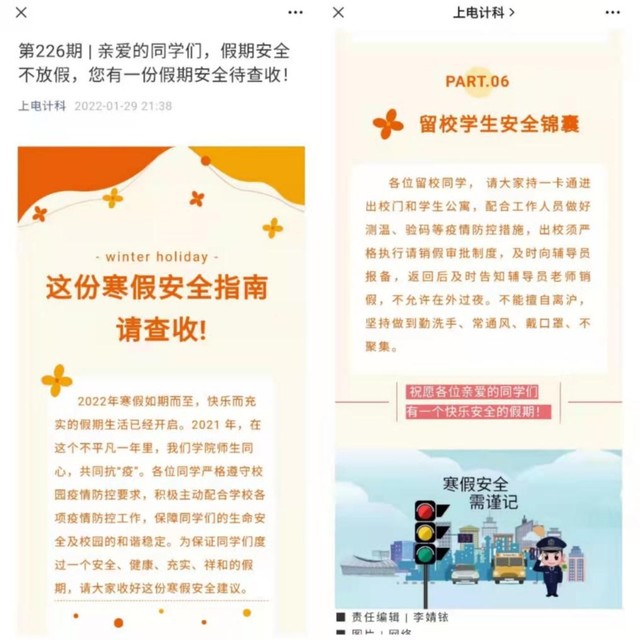 学院还通过微信平台推出“假期安全不放假”微信推送结合疫情防控、交通安全、消防安全、食品卫生安全、防范传销和电信诈骗等内容教育引导同学们提高安全意识和自我保护意识。