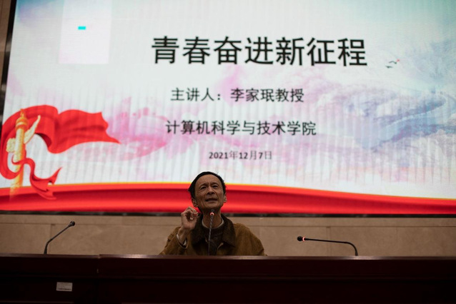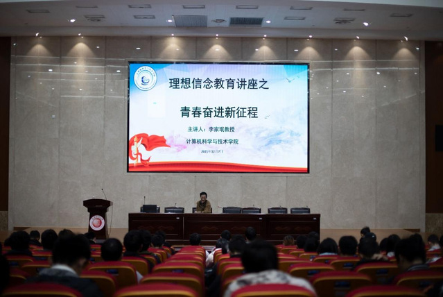 李家珉教授以“青春奋进新征程”为主题,为学院同学上了一堂别开生面的理想信念课。他讲到高校承担着立德树人的根本任务,必须把理想信念教育放在首位,为大家介绍了“大学是什么”,接着提出“让奋斗的人生更加出彩”,并给同学们提出七点要求:一是要有梦想,以青春之我,奋斗之我,为民族复兴铺路架桥,为祖国建设添砖加瓦;二是要有理想,青年大学生要积极参与实现中国梦的伟大实践;三是要有责任担当,并解释道理想是前提、本领是基础、担当是保障;四是要勇于奋斗,提出奋斗本身就是一种幸福;五是要努力学习,需把学习作为首要任务;六、要学会自我管理,遵纪守法,遵守校规校纪;七是珍惜身体健康。