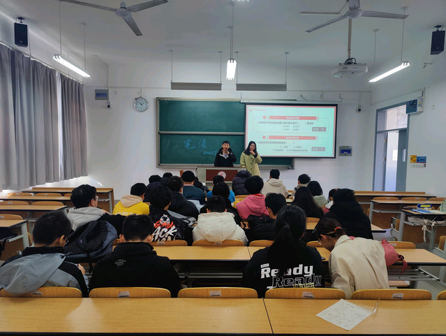 “学宪法,讲宪法”,学院将学讲宪法活动与党史教育相结合,通过班干部宣讲、学生交流、知识竞答以及学生宣誓等形式,开展以宪法为核心的法治宣传教育主题班会。2021年11月22日至今,学院共组织开展主题班会近30场,涵盖全院本科生800余人。在主题班会中,班级以爱国主义教育为重点,紧密结合历史文化,进一步普及宪法知识,并针对近期学生遭遇的诈骗案件,在法治宣传教育中增加了防诈骗普法宣传,意在提高学生的辨别能力。