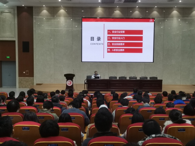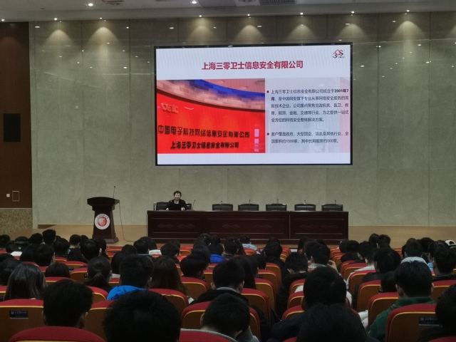 首先,三零卫士人事总监刘轶对公司发展做了简单介绍。上海三零卫士信息安全有限公司是中国电子科技网络信息安全有限公司旗下专业从事网络安全服务的高新技术企业,公司重点聚焦党政机关、医卫、教育、能源、军工、金融、交通等行业,是国内网络空间安全领域具有鲜明特色的综合性网络安全服务提供商。她希望,学生们能够做好求职准备,以良好的状态进入公司学习工作。随后,三零卫士安全实验室负责人李德从安全行业背景、安全行业入门、安全技能要求和入职安全素养几个方面展开了“安全行业入门到入职”主题讲座。他强调,学生在求职前要知己知彼,在面试中要有态度、有规划,在工作中要有体能、细心、耐心和恒心,做到勤奋负责,自我学习,友善自律。