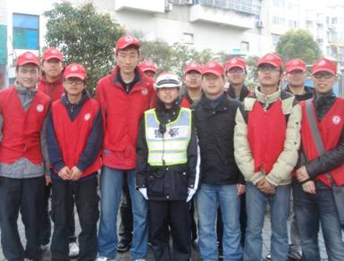 下午4点虽然下着中雨,同学们准时到达目的地,南汇交警支队的虞警官,讲解了关于安全出行的交通规则和关于疏通交通的基本动作。之后同学们穿上交通协管志愿者的服装开始志愿者活动,大家分散在两个十字路口的八个口,或发传单,或疏散交通,分工明确。此时正值高峰期,由于协助交警进行的恰当的疏通,丝毫没有拥挤的现象。