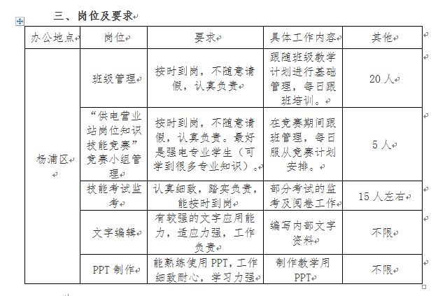 校团委和申电进修学院(即上海市国家电网培训中心)启动了一项暑期挂职锻炼,时间是7月12日―8月31日,具体工作岗位如图。
