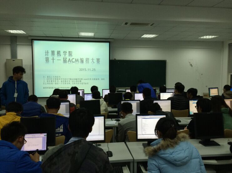 11月25日晚18点,我院第十一届ACM编程大赛在奋进楼四楼五机房举行。作为学院特色活动,历经十届历史,ACM编程大赛总结经验,力求办得更好。本届ACM编程大赛共有25个小组96名同学参加。为促进各年级同学的交流,也为大一同学更快地融入编程领域,我们实行了“老鸟带新鸟”的策略,要求本次比赛需要3~4人组队,并且每个队伍中高年级同学不得超过2人,也就是说,每个队伍中必须存在大一同学。同时,为了让大一同学能在团队中作出贡献,而不是面对编程题束手无策,我们在赛前一周为大一同学提供赛前辅导,以比赛类型相关的编程题作为辅导题进行短期训练,力求在比赛时取得好成绩。