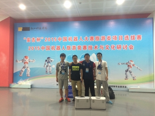 学院机器人实验室还曾于今年6月在浙江安吉浙江科技学院参加了2015“安吉杯”中国机器人大赛旅游项目选拔赛,由闵超、徐嘉辰、孙威、万博组成的代表队在全国50多所高校的200余支队伍中取得了二等奖的成绩,获得了参加2015Robocup中国总决赛的资格。